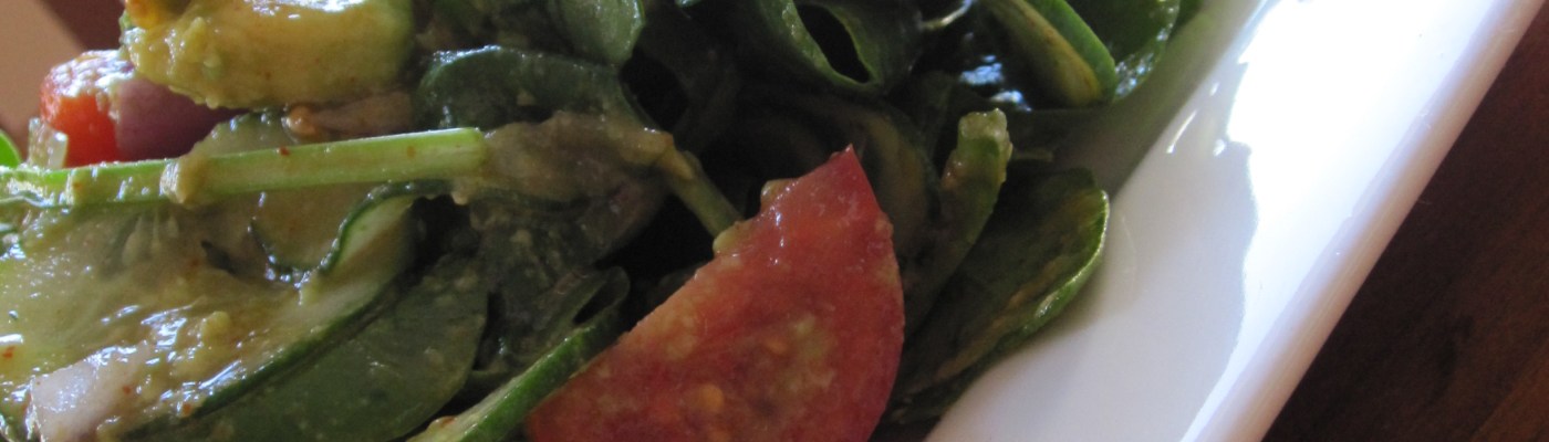 Slice the avocado in half and spoon out the flesh – dice. In a large mixing bowl combine with all the other ingredients. Toss really well so that the avocado, salt, cayenne, oil and lemon coats the greens. Serve. Makes 4 side serves.