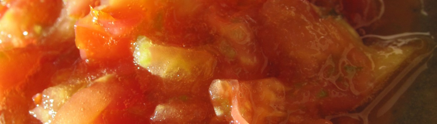 In a food processor blend tomatoes, onions and peppers together – stir through garlic, lemon and salt.