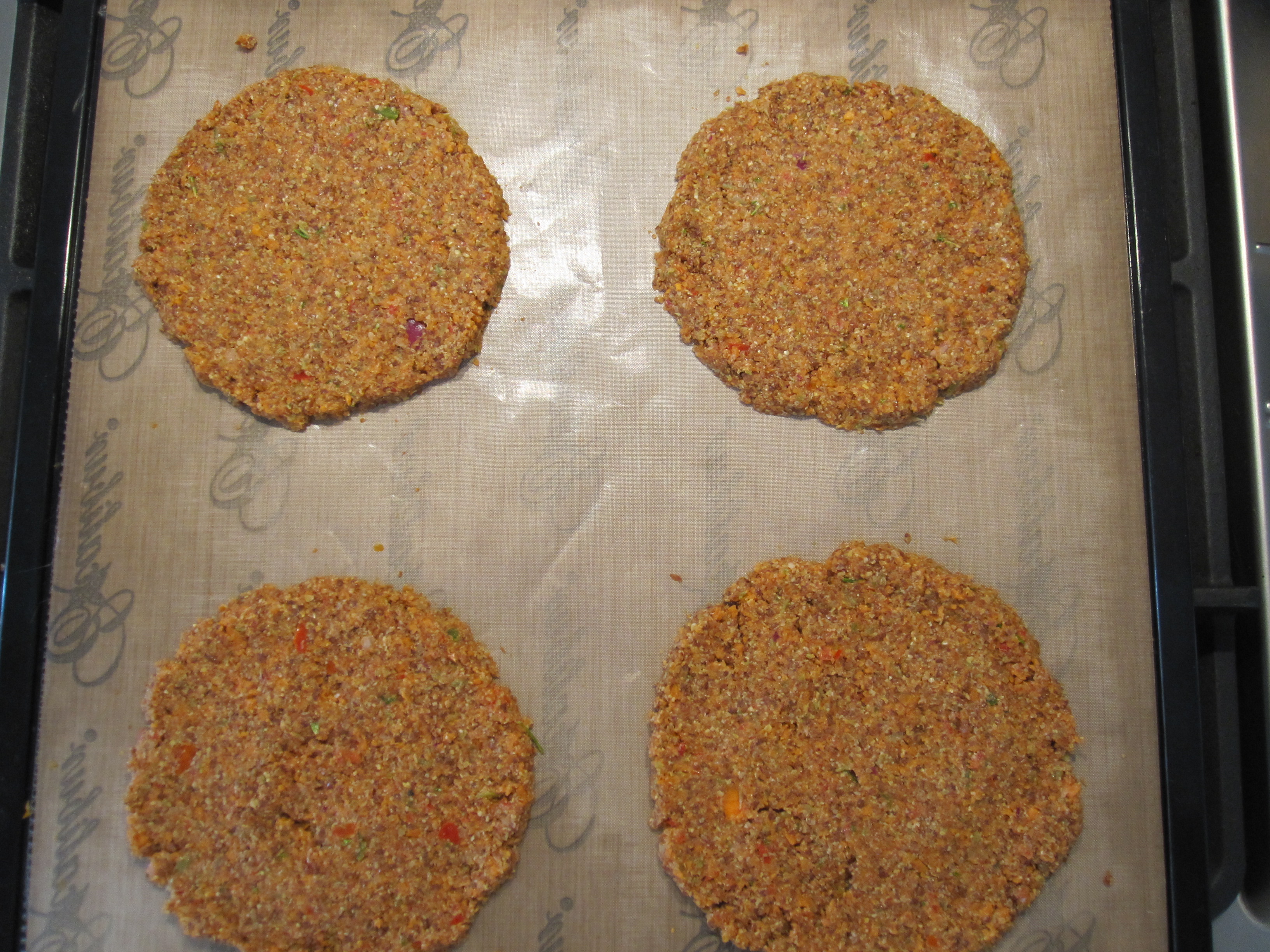 Place 1/2 cup fulls of mixture onto the lined dehydrating tray. Use a spatula or metal spoon to spread mixture into 6 inch rounds. I made 6 pizza crusts from this mixture. Dehydrate at 115 degrees Fahrenheit for 6 hours – then turn the crusts and dehydrate a further 2 hours.