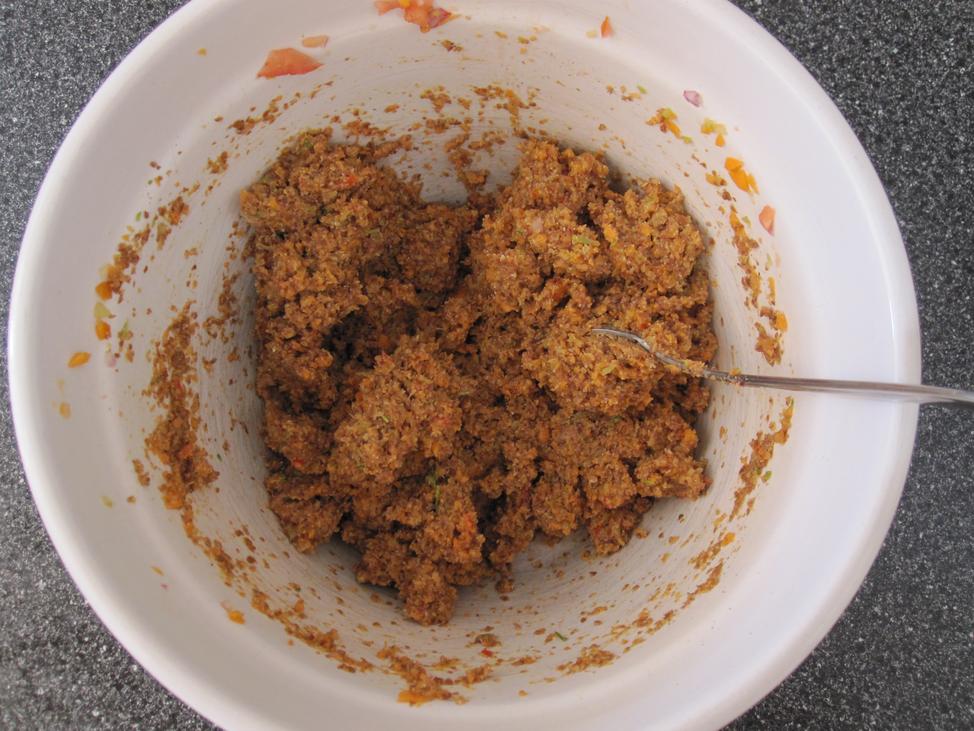 Add the flax meal and mix until the batter is spreadable but firm. You can add more flax meal if the dough is too wet or if too dry a Tbsp water.