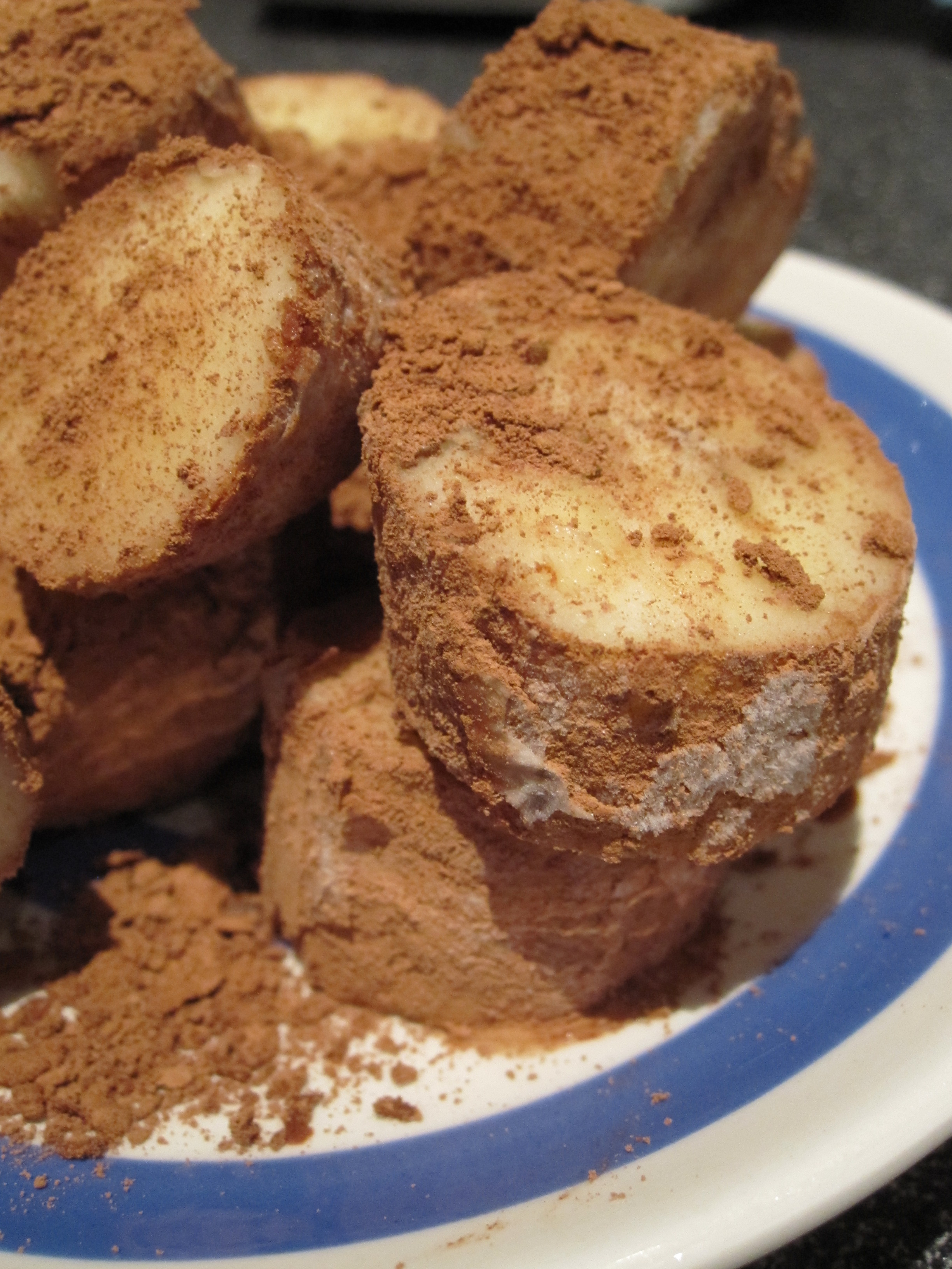 Peel the banana and roll in the cacao until the banana is well coated. Wrap in clip wrap and freeze for at least 4 hours. When finished frozen, chop into pieces and serve. Sprinkle with extra cacao if you like.