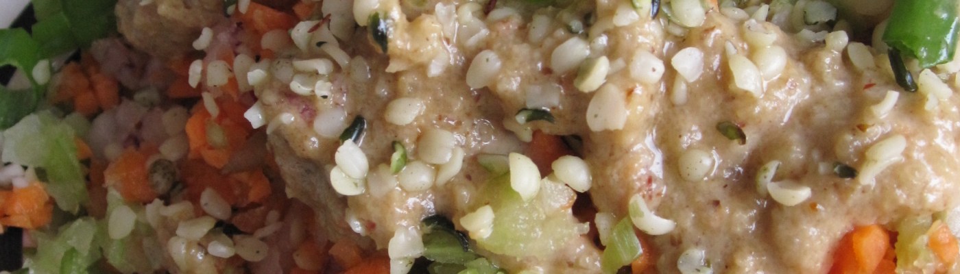 In the food processor, process together 1/2 tsp. Tahini, 1/2 Tbsp. olive oil, 2 tsp. Nama Shoyu, 1/2 Tbsp. macadamia oil and 1/2 Tbsp. lemon juice.