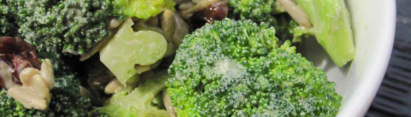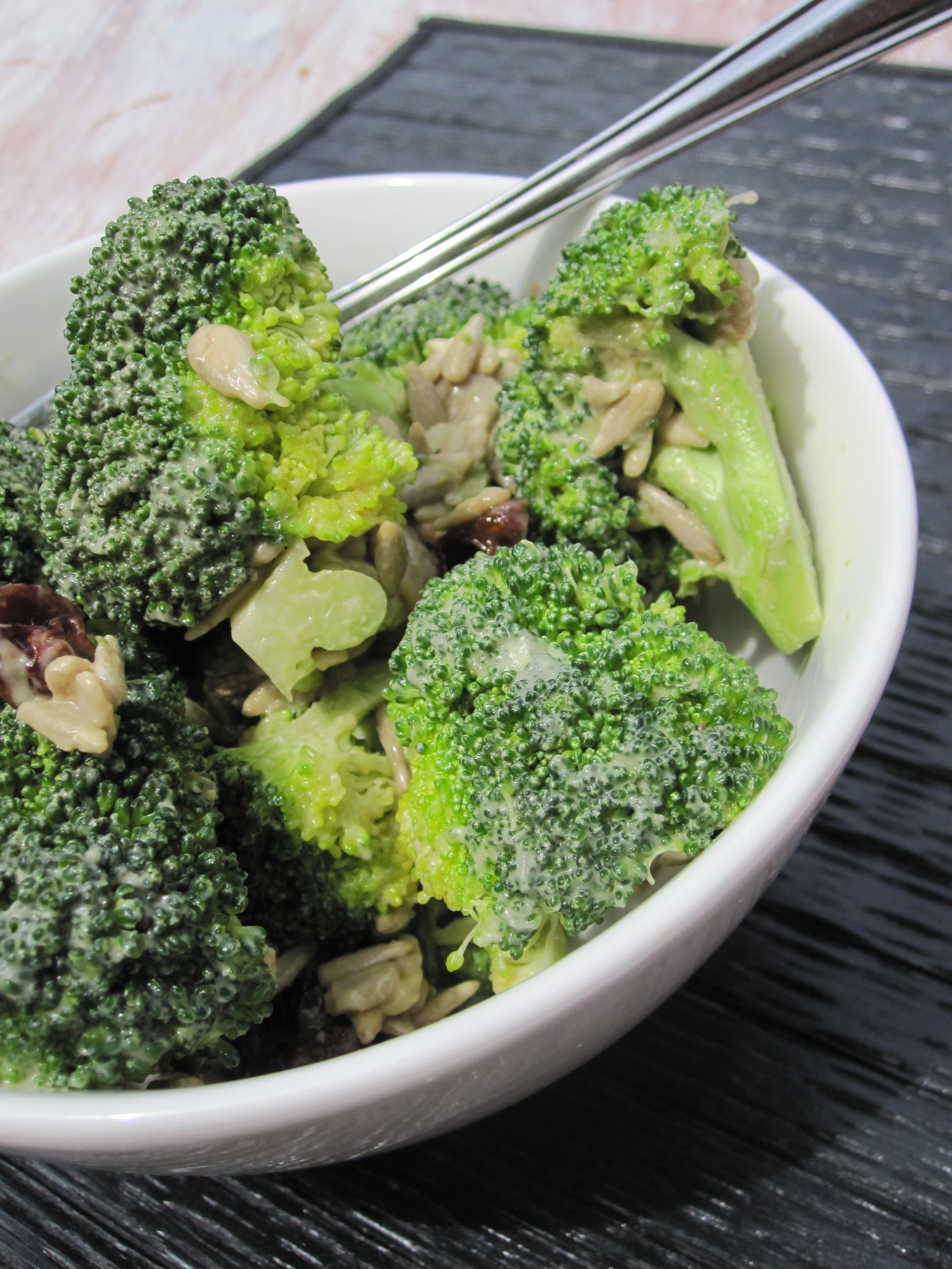 Upon eating the salad – I was very conscious that I was eating raw broccoli. Having never been a great fan of broccoli I was feeling a bit like – I don’t really want to eat this… But soon I was merrily munching away – almost forgot that I was eating broccoli. If I make it again I will cut the broccoli into even smaller pieces. The light but creamy dressing, the crunch of the broccoli, the nuttiness of the sunflower seeds and the sweet raisins works really well together.