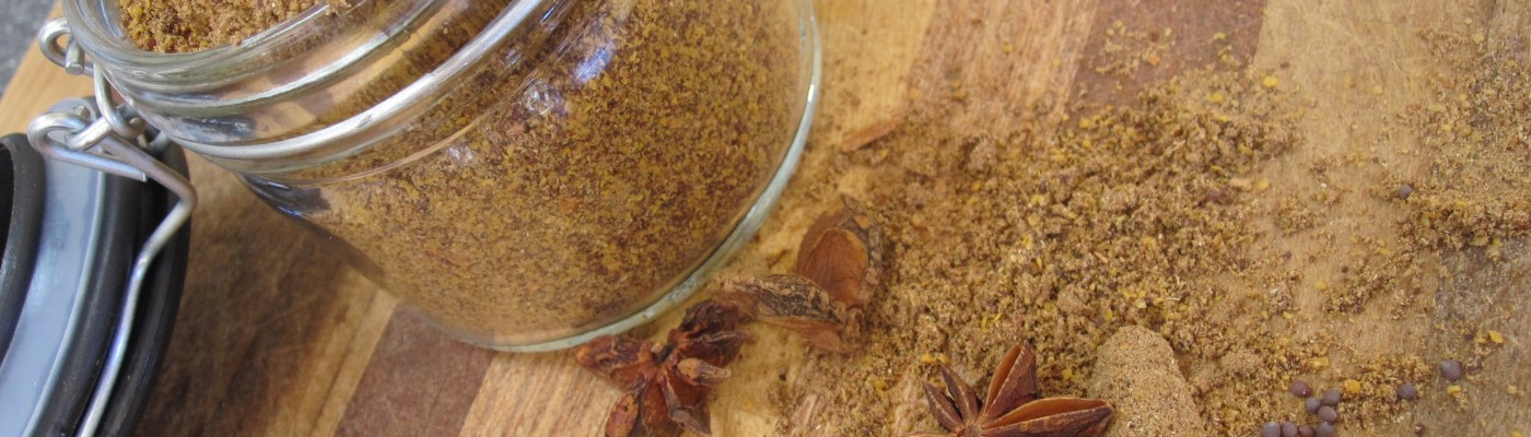 Put all ingredients in a spice or coffee grinder. Grind spices.
