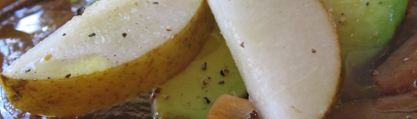 Garnish with chopped avocado, pear and shavings of carrot and a drizzle of olive oil.