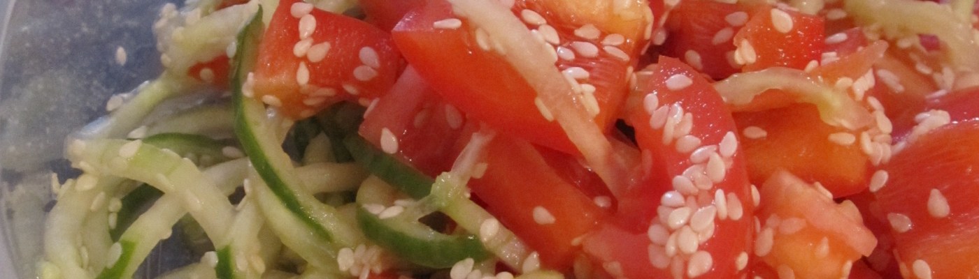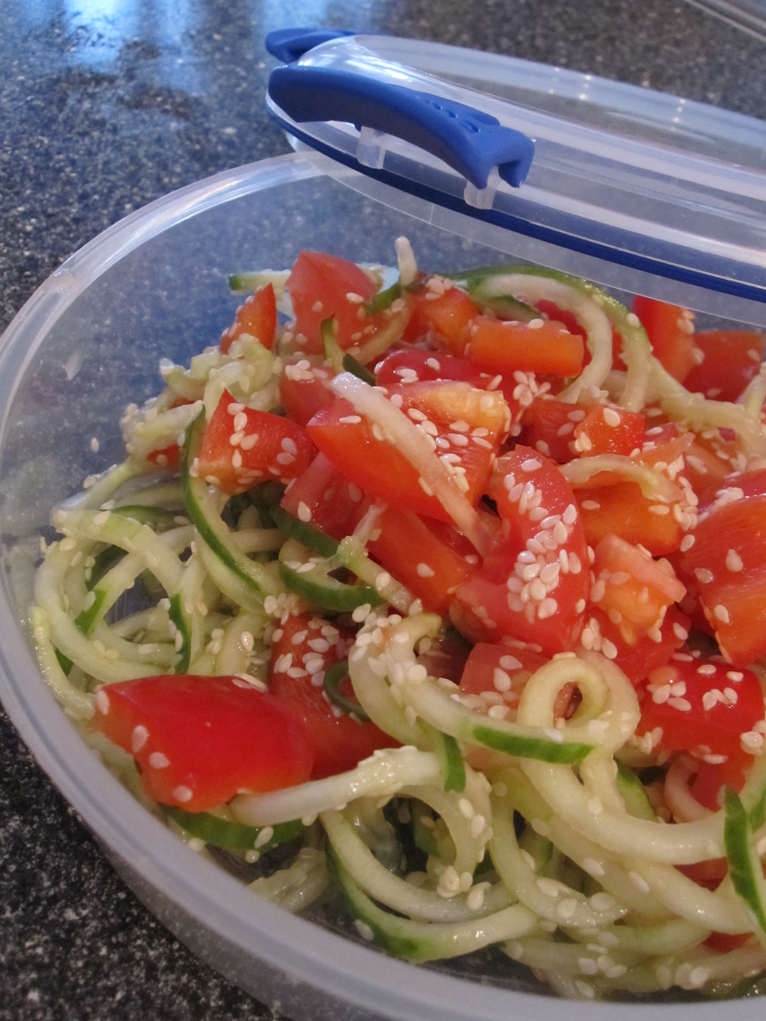 1 large cucumber, spiralled on a spiral slicer (best thing I bought for $30 from a kitchen shop)