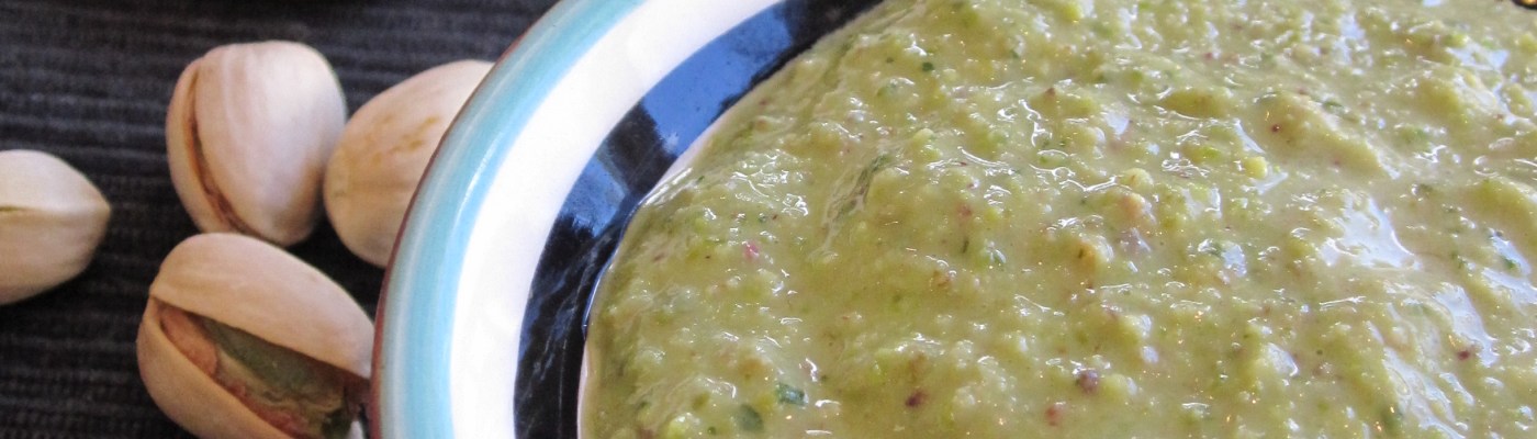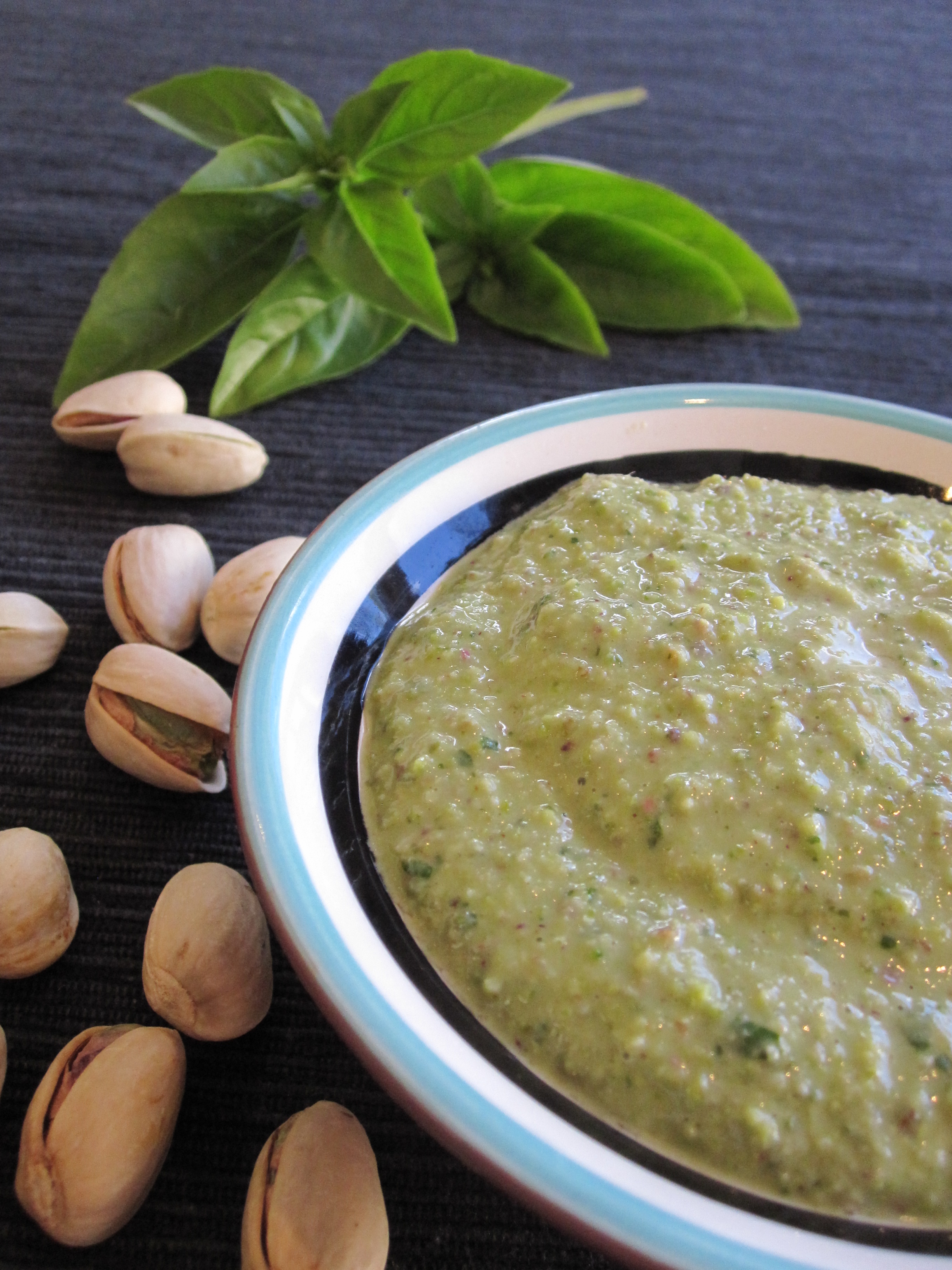In a blender, combine 1/2 cup olive oil, coconut water and pistachios. Blend well and set aside. Then blend the basil, remaining olive oil, garlic and salt. Add the milky pistachio mixture and blend.