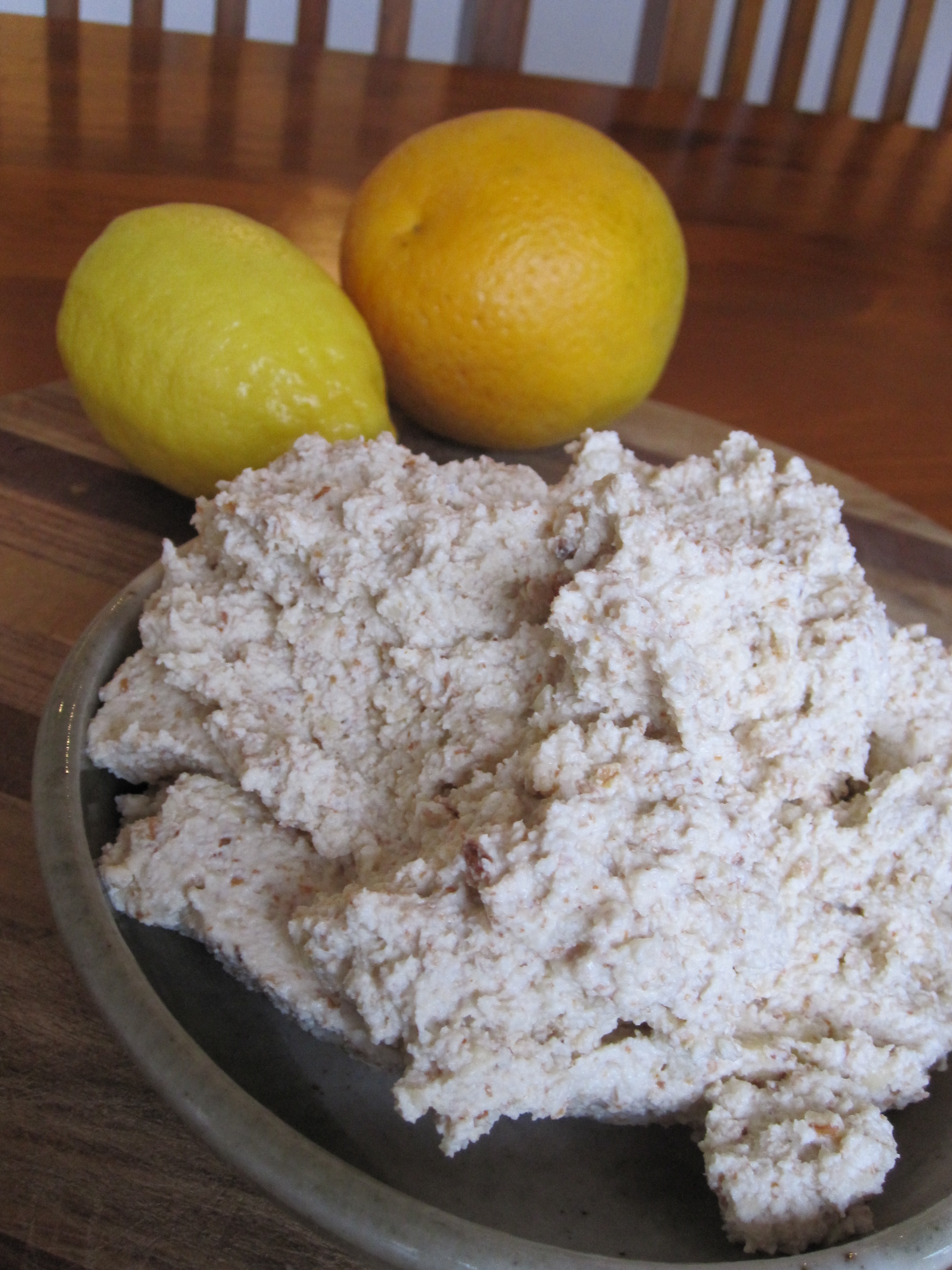 Put nuts, lemon and orange juice, and 1/4 cup water into a food processor. Blend until creamy and ricotta like.