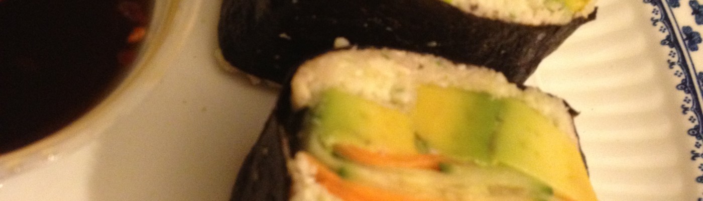 Lay a nori sheet, shiny side down on a chopping board. Spread the cauliflower – cashew mixture into a 1 1/2 inch thick strip onto the nori about 2 inches from the edge of your nori sheet as you would for making sushi, add the carrot, cucumber and avocado and finish with layer of the cashew mixture.