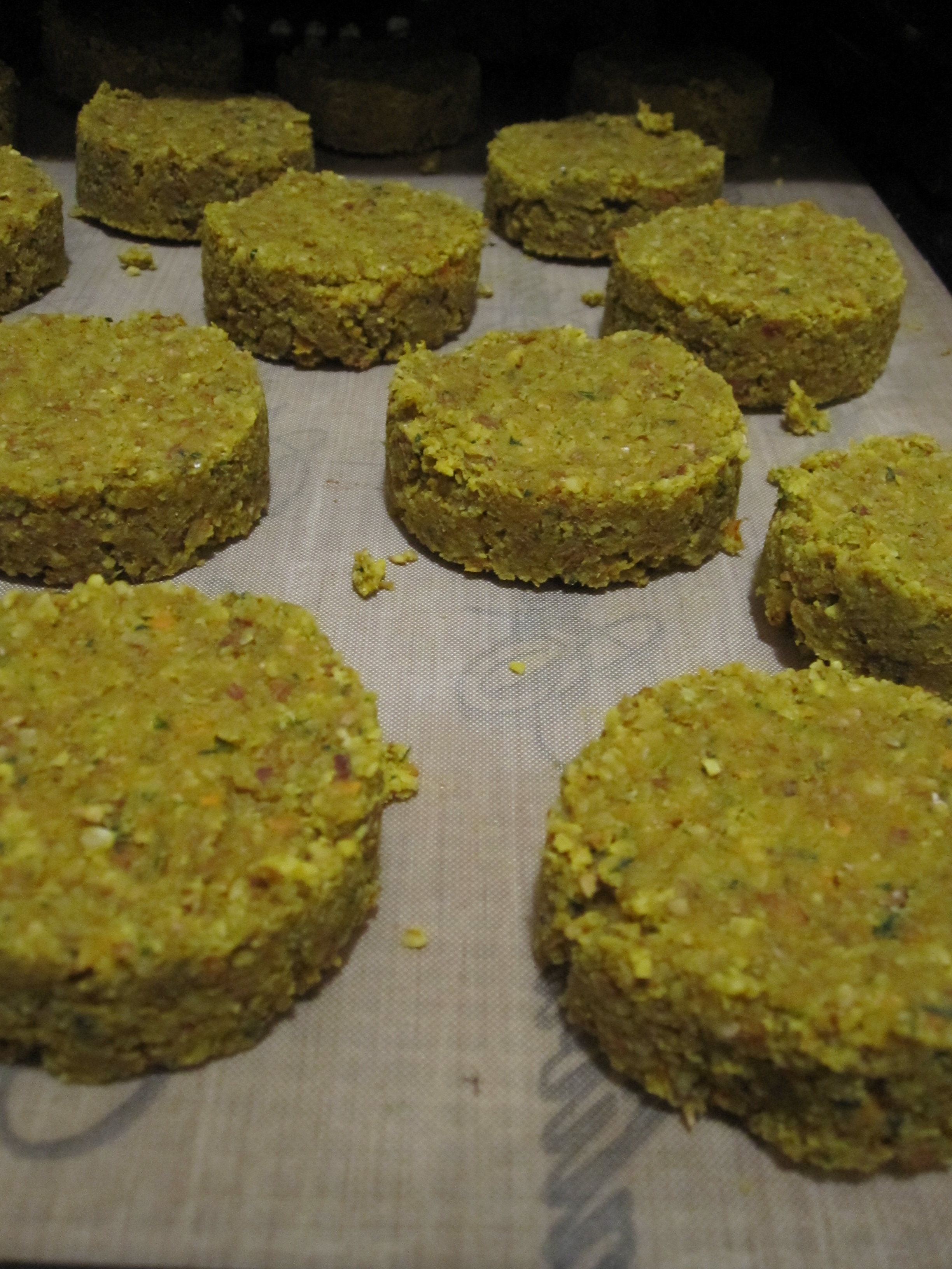 On a lined dehydrator tray, place a scone or cookie dough cutter. Press mixture into the cutter and then remove cutter leaving a round flat dough falafel.