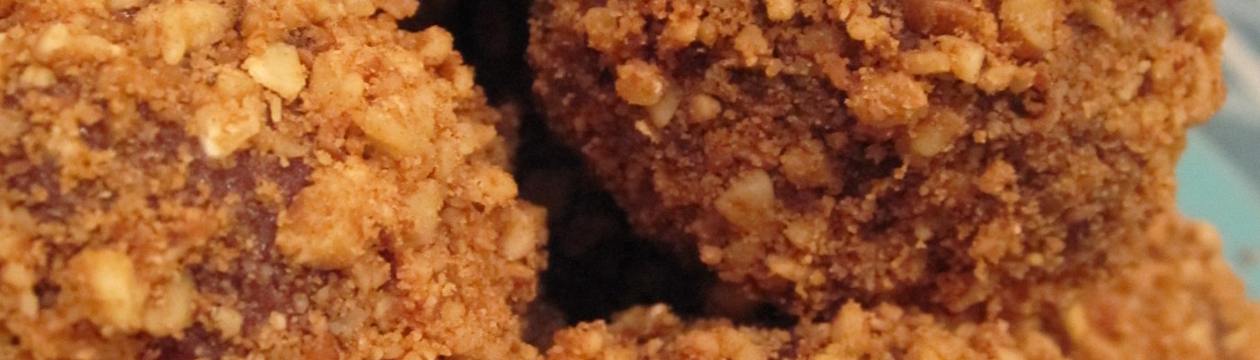 Using a spoon, scoop 2 Tbsp. of base and form into a ball by rolling in your hands, roll in the pecan mixture and set aside.