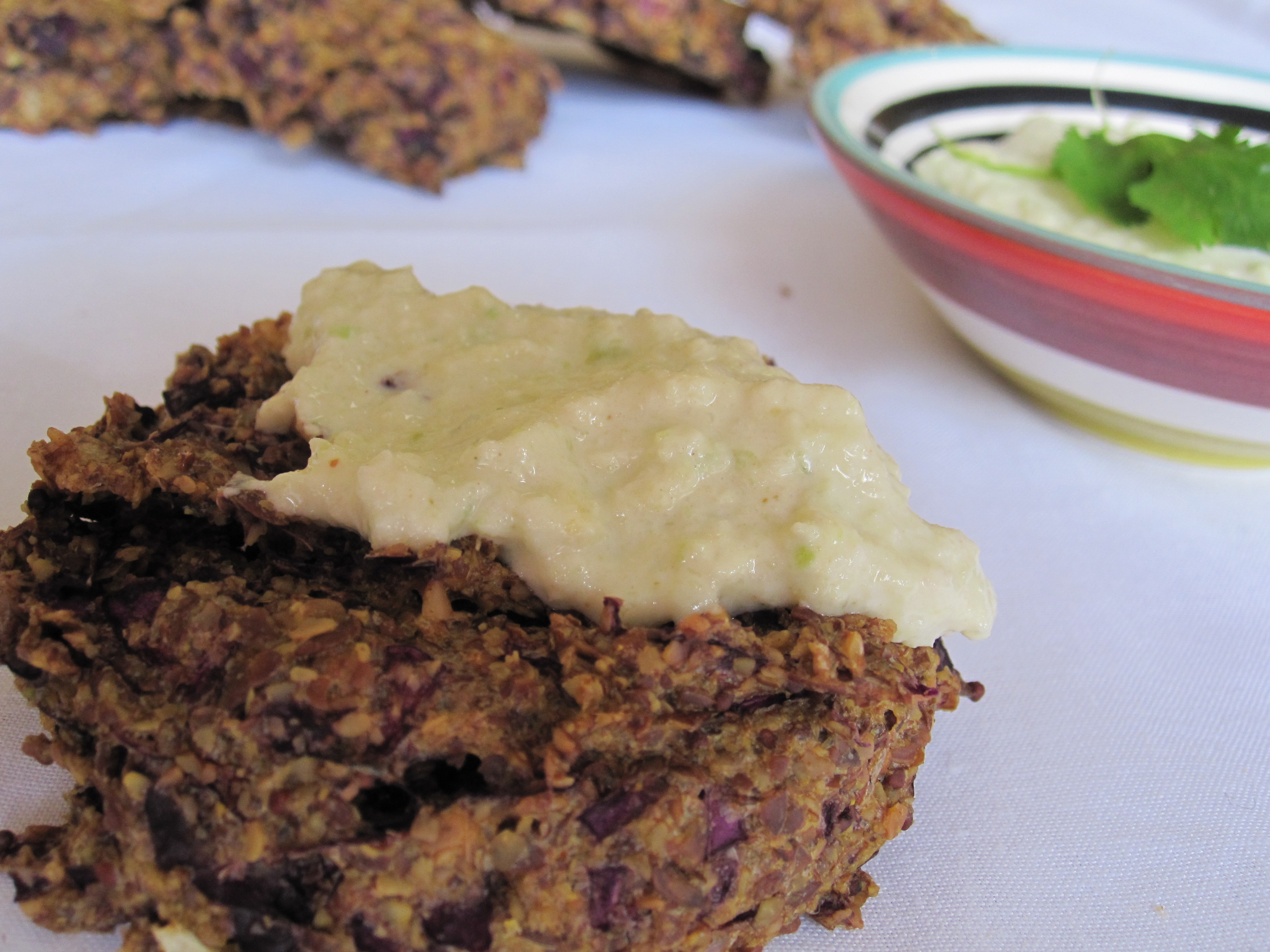 Place the ground flaxseed and other ingredients (except the water, cabbage and onion) into a food processor and process until combined. Add in enough water to make a batter consistency.
