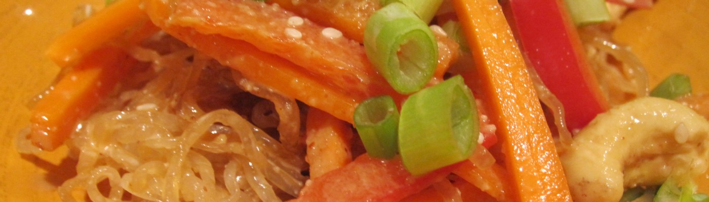 In a large bowl, combine the noodles, capsicum, carrots and sauce. Garnish with onions, sesame seeds and cashews. And then eat – yum yum yum!