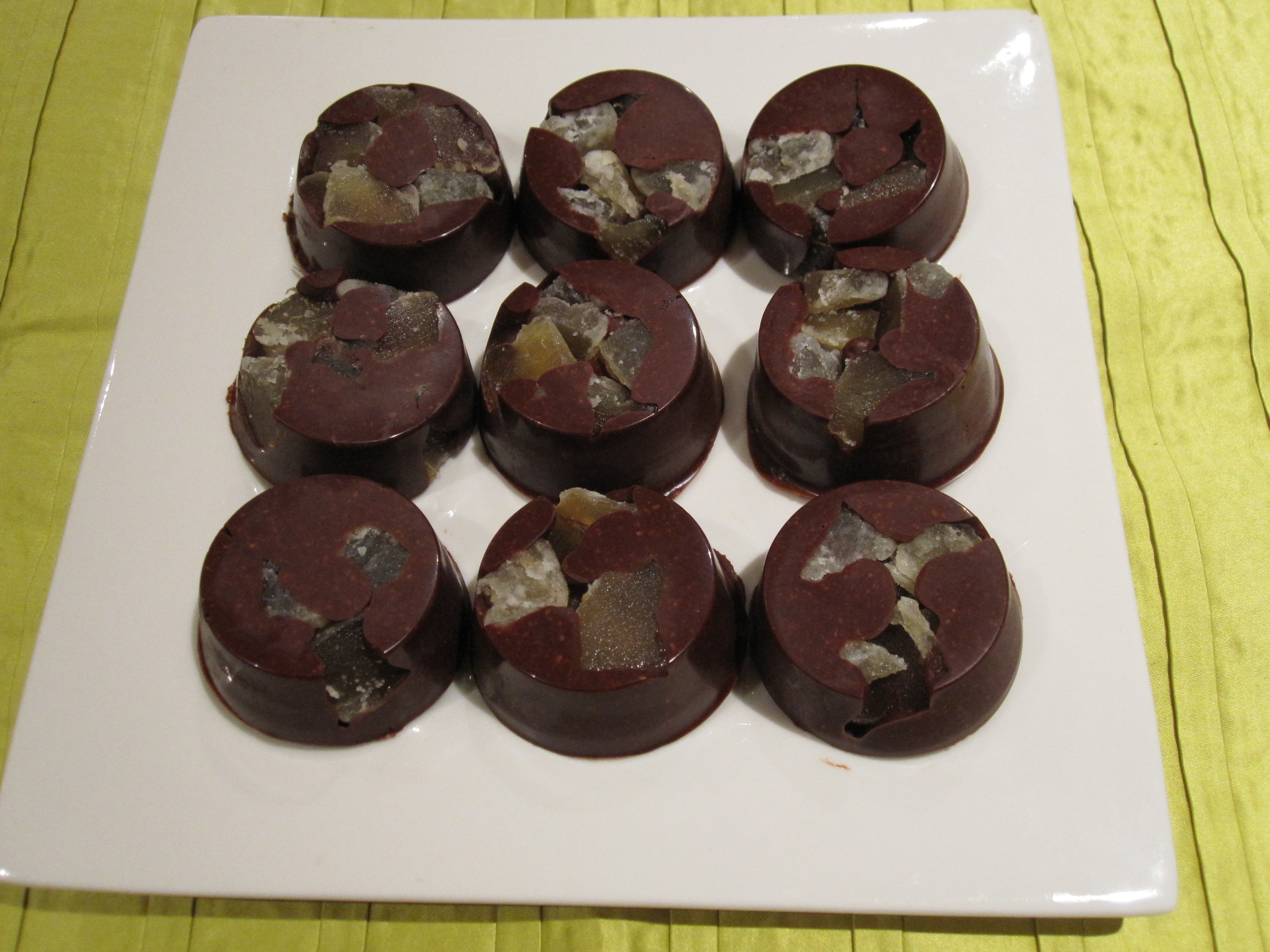 In into the bottom of a silicon chocolate mold place the crystallised ginger pieces. The chocolate will be poured over the top of these.