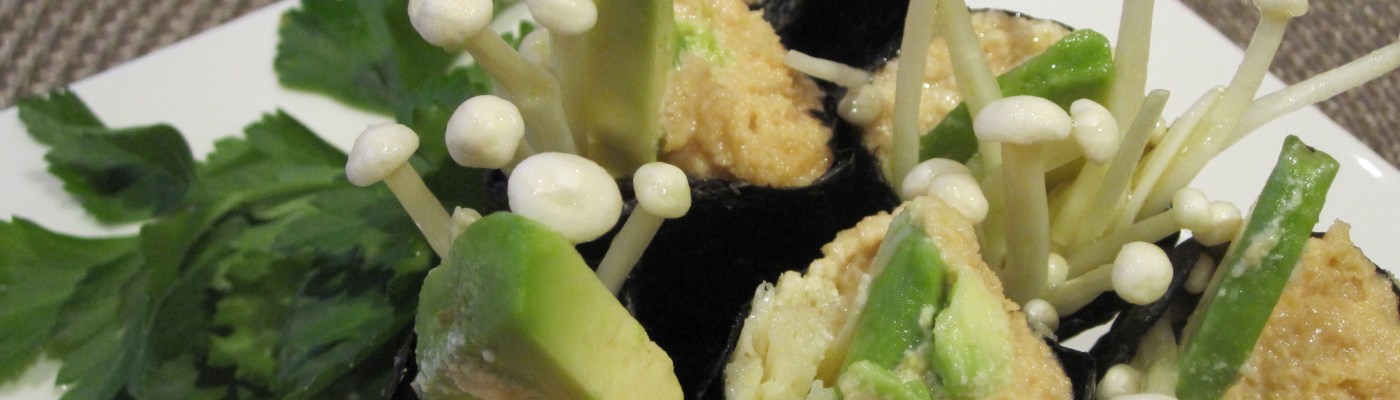 I made up a quick cheese with Tamari as the ‘rice’ part of the sushi, then added some marinated Enoki and some sliced avocado.