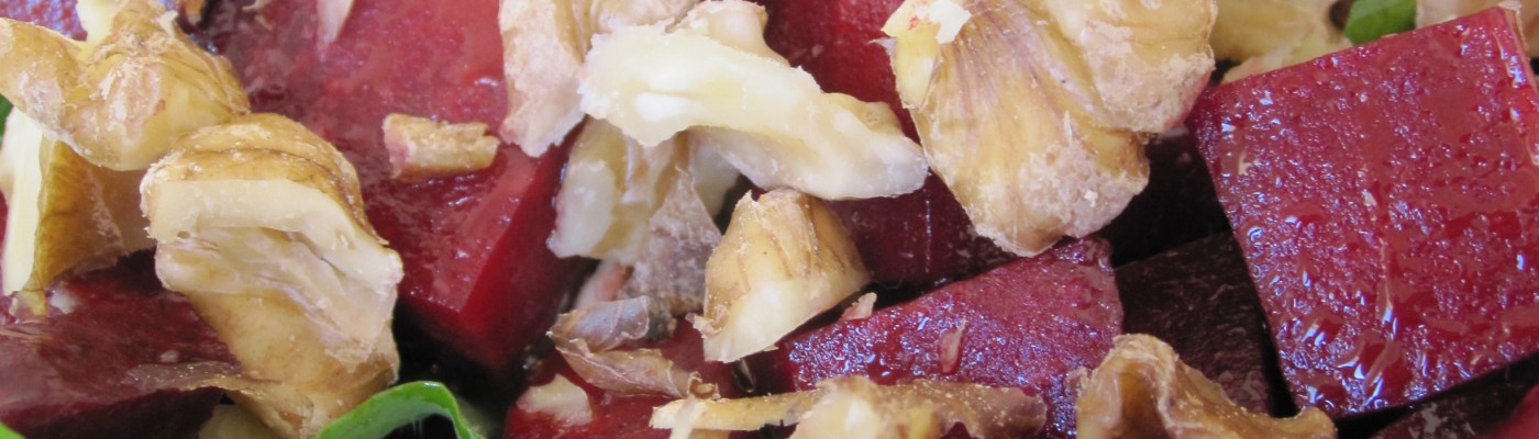 Combine the dressing ingredients in a bowl and add the diced beetroot. If you have time allow the beetroot to sit in the dressing for 1/2 hour.
