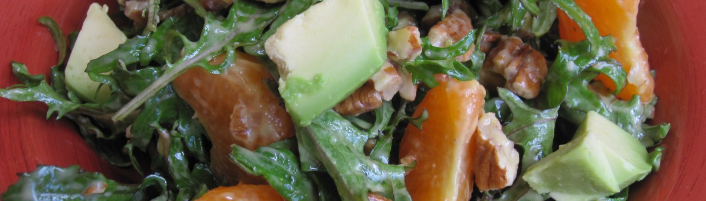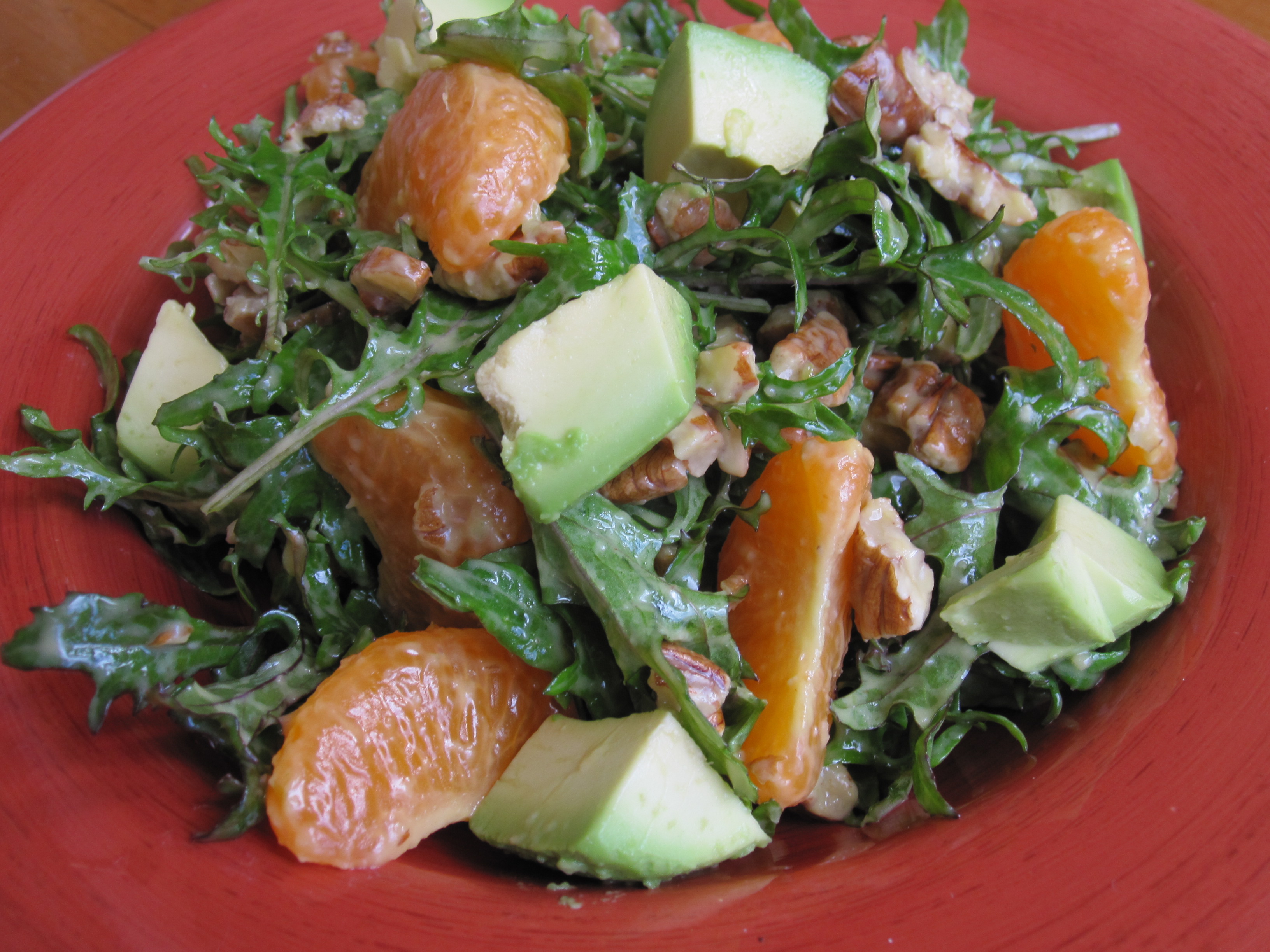 In a large bowl, add 1/3 cup dressing and mandarin segments. Toss until well coated. Add the pecans and again coat them well with dressing. Finally, add the greens and (I use my hands for this part) coat well in the dressing.