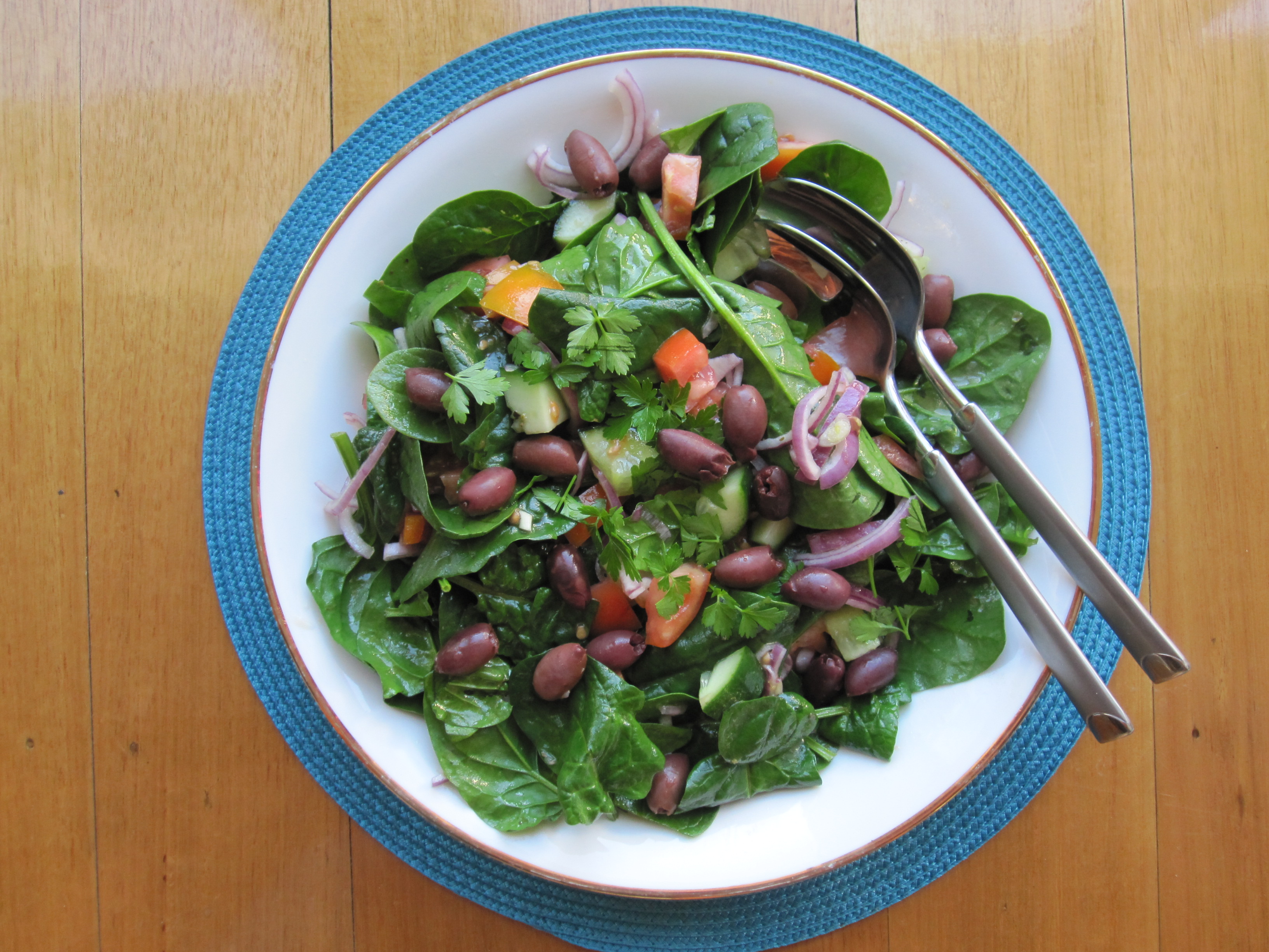 Combine the spinach, onion, cucumber and tomato together in a large bowl. Add the dressing and toss to coat (I always use my hands it just works so much better!).