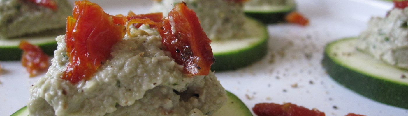 Lay out zucchini slices on a platter. Top with spoon fulls of nut basil mixture. Garnish with sun-dried tomatoes.