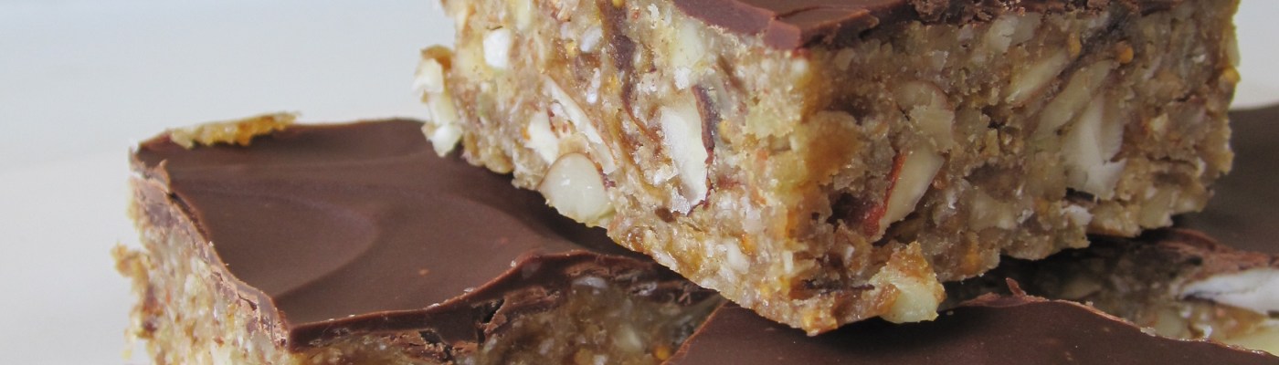 Place all your ingredients into (except chocolate) into a high speed processor and pulse until well combined and roughly chopped. I left the texture quite rough so you get that crunch when you bite into the slice.