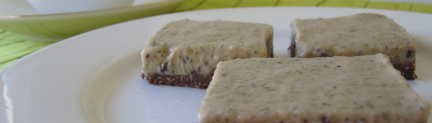 The picture that came with the Nut Free Mint Cheesecake recipe (note I added slice as there is no way what turned out looks anything like a cheesecake) was a lovely high round cheesecake with a vibrant green colouring that holds it’s form… ummm… nothing like the flat brownish, gooey slice that turned out!