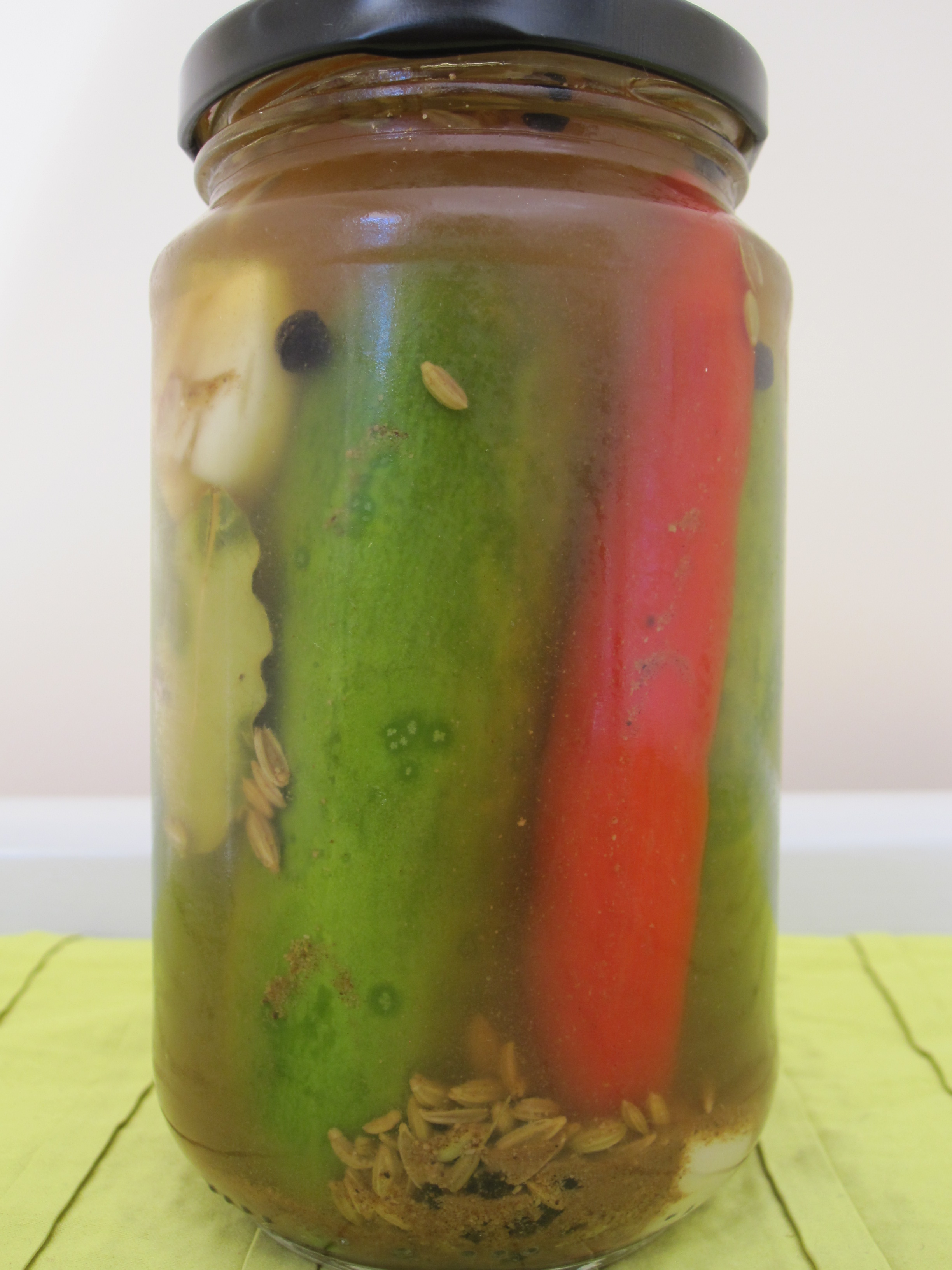 Whisk together the remaining ingredients and pour over the cucumbers to fill the jar, ensure that you cover the tops of the cucumbers.