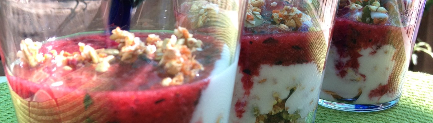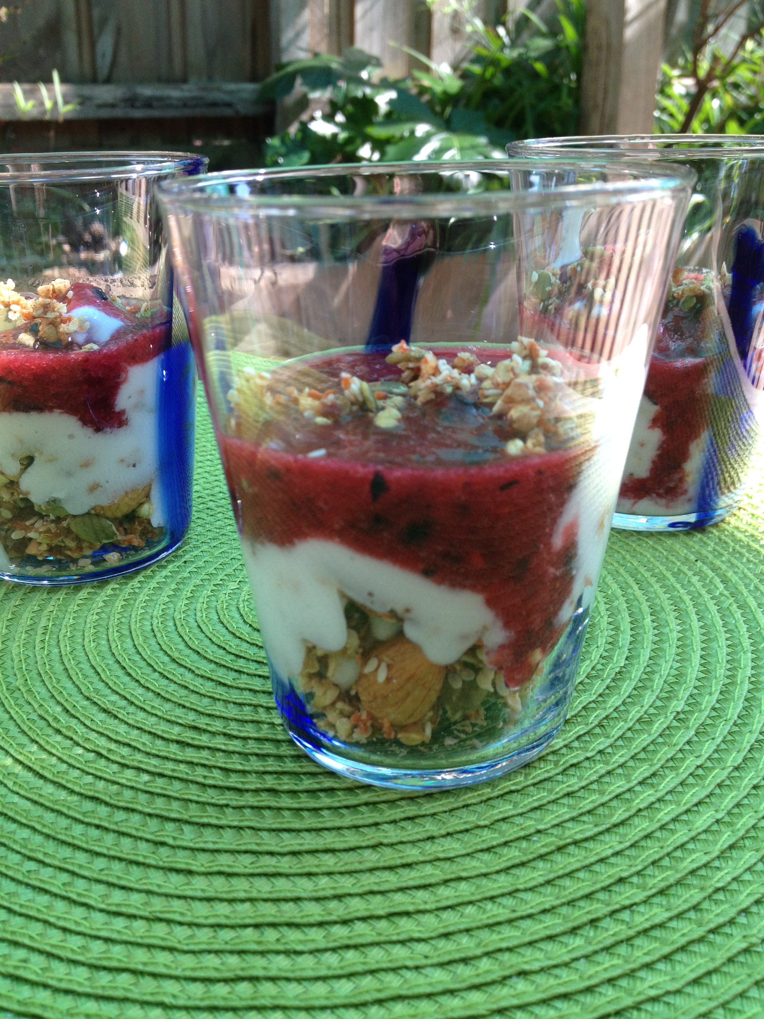 Inspired by a recipe from Luke and Scott – I decided to convert their Paleo Parfait (thanks Fiona) into a Raw Breakfast Parfait and I must say I am rapt with the result – there is definitely the potential for these 4 creamy crunchy berry delights to be gone before the end of today – it will be hard leaving them for my breakfast tomorrow!